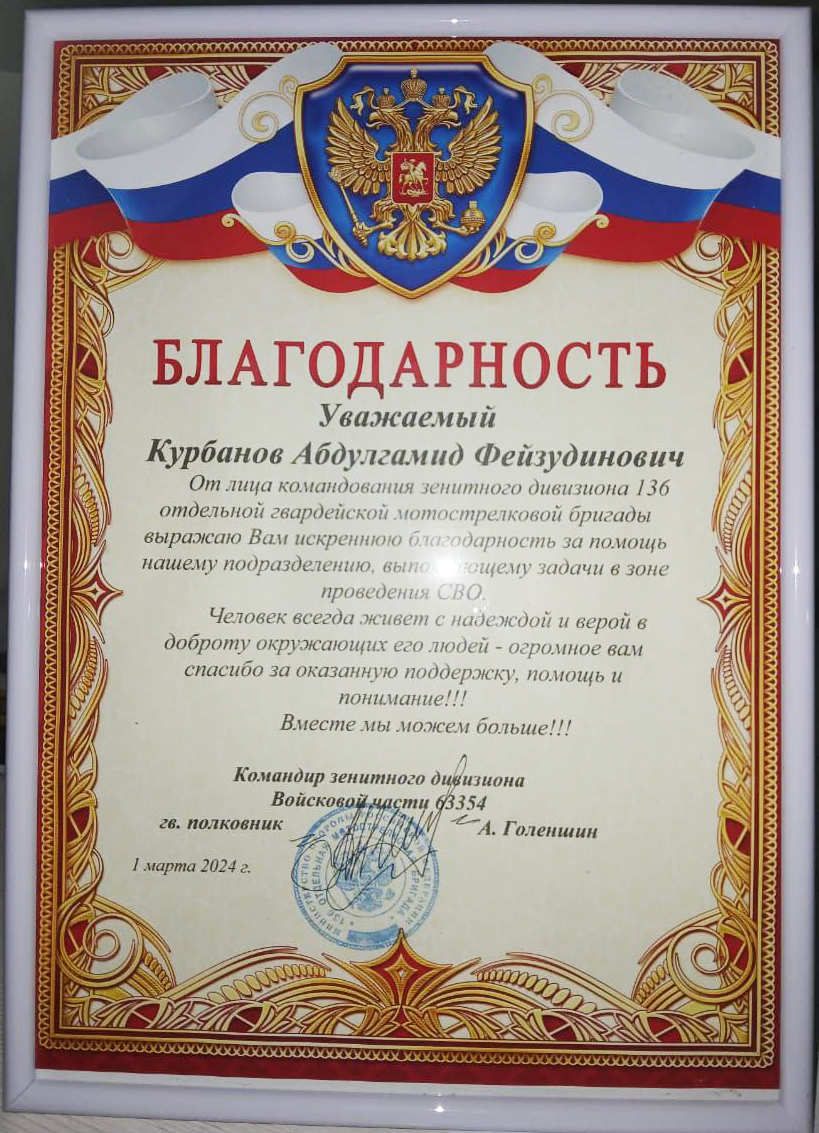 Командование зенитного дивизиона 136 отдельной гвардейской мотострелковой бригады выразило благодарность генеральному директору общества с ограниченной ответственностью «Магнум» Андрею Витальевичу Петрушову и Абдулгамиду Фейзудиновичу Курбанову, отправившим бойцам на передовую комплект запчастей на автомобиль «Нива». Это поможет обеспечить плановые и текущие ремонты в ходе проведения специальной военной операции.