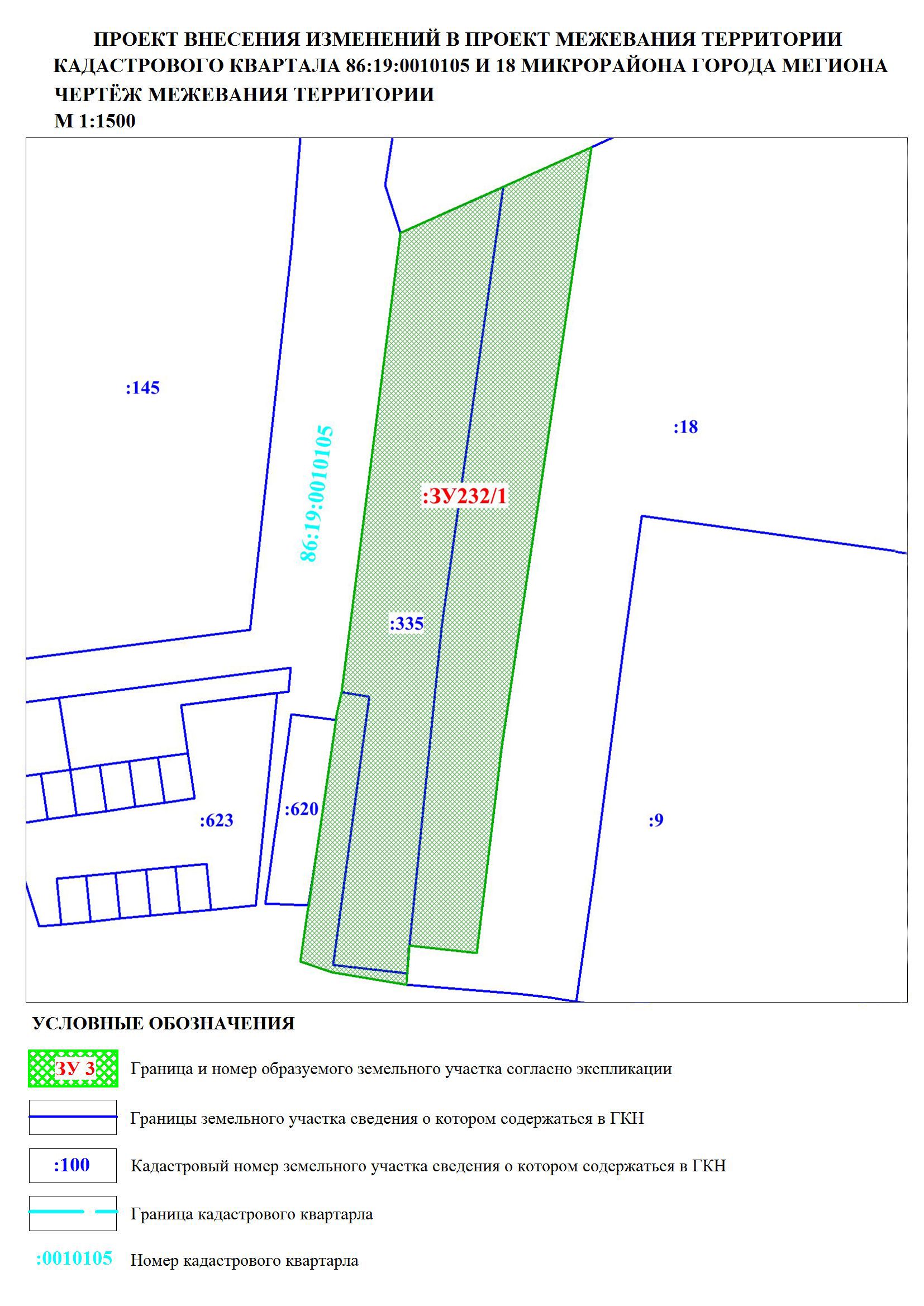 Внесения изменений в проект планировки и проект межевания разработан на территорию кадастрового квартала 86:19:0010105 и 18 микрорайона города Мегиона. Проект разработан на основании постановления от 24.01.2022 №121 «О подготовке проекта внесения изменений в проект межевания территорий кадастрового квартала 86:19:0010105 и 18 микрорайона города Мегиона» для формирования земельного участка с видом разрешенного использования «Служебные гаражи», изменения видов разрешенного использования участков №231 на «Земельные участки (территории) общего пользования», №232 на «Складские площадки».